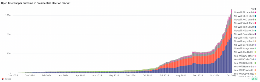 Data dari platform Dune Analytic juga menunjukkan nilai total open interest untuk pemilihan presiden AS 2024 di Polymarket sebenarnya hanya sebesar $150 juta. Angka ini berbeda jauh dengan angka yang dilaporkan Polymarket, yang diduga karena para trader di platform tersebut terus menjual posisi mereka satu sama lain, yang turut memperbesar angka volume perdagangan tanpa menambah dana baru.