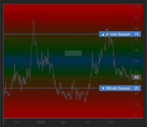Beberapa indeks pasar memberikan gambaran yang lebih jelas tentang kondisi ini. Altcoin Season Index dari Blockchain Center, yang mengukur performa 100 altcoin teratas terhadap Bitcoin dalam periode 90 hari, menunjukkan pembacaan yang konsisten berada di bawah angka 50 sepanjang sebagian besar tahun 2024 hingga menjelang akhir 2025. Angka di bawah 25 mengindikasikan Bitcoin season, sementara di atas 75 menandakan altseason. Fakta bahwa indeks ini jarang menyentuh zona altseason menunjukkan dominasi Bitcoin yang berkelanjutan.