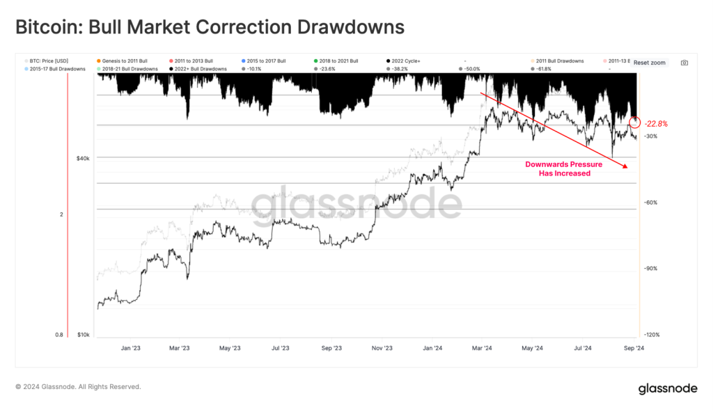 Platform analitik on-chain Glassnode dalam laporan terbarunya mengungkapkan, dari perspektif makro, harga spot Bitcoin saat ini yang diperdagangkan 22% di bawah ATH, masih berada dalam taraf wajar dibandingkan dengan penurunan yang terjadi di beberapa bear market sebelumnya.