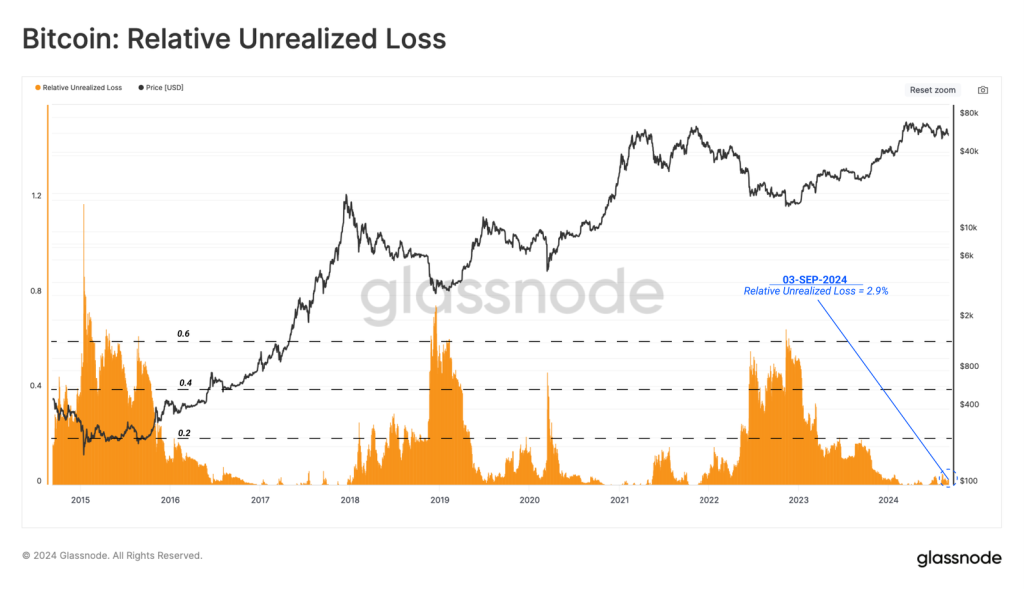 Dari perspektif pasar yang lebih luas, kerugian yang belum direalisasi (unrealized loss) investor ternyata secara historis masih tetap rendah. Glassnode mengungkapkan, total kerugian ini hanya 2,9% dari kapitalisasi pasar Bitcoin.