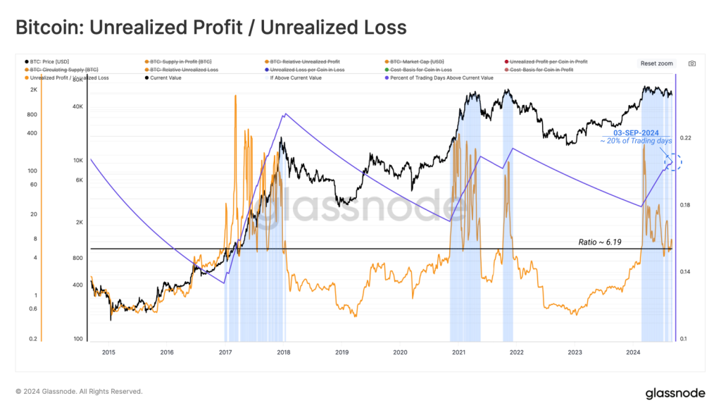 Sekitar 20% hari perdagangan menunjukkan rasio ini berada di atas nilai Bitcoin saat ini, yang menunjukkan posisi keuangan rata-rata investor berada dalam posisi kuat.
