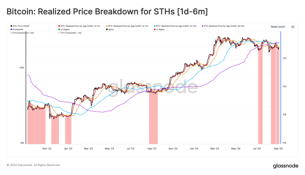 Mayoritas unrealized loss didominasi pemegang Bitcoin jangka pendek atau short-term holder (STH), yang nilainya terus meningkat dalam beberapa bulan terakhir. Semua kelompok STH dalam posisi underwater dengan perincian rata-rata cost basis berikut:
