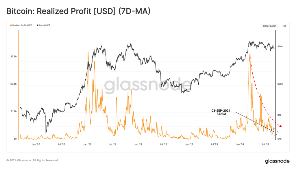 Sementara untuk metrik keuntungan/kerugian yang telah direalisasikan (realized profit/loss), Glassnode mengungkapkan, volume profitabilitas investor yang melakukan aksi jual semakin rendah sejak Bitcoin ATH pada Maret lalu.