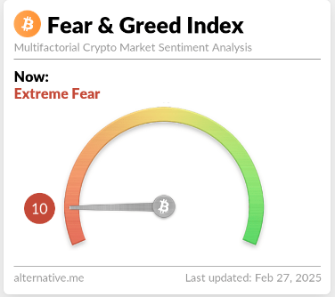 Volubit.id — Sentimen pasar dalam Crypto Fear & Greed Index telah jatuh ke level terendah dalam lebih dari dua tahun terakhir, usai harga Bitcoin anjlok ke bawah $85.000. Pada 27 Februari 2025, indeks tersebut semakin dalam memasuki level “Extreme Fear,” dengan skor 10.