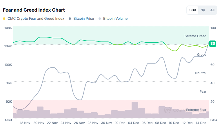 Sentimen investor dalam fear and greed indeks terpantau masih ada dalam posisi extreme greed di level 80. Level ini menunjukkan pasar sedang berada dalam suasana optimisme tinggi dan banyak investor yang percaya diri harga akan terus naik.