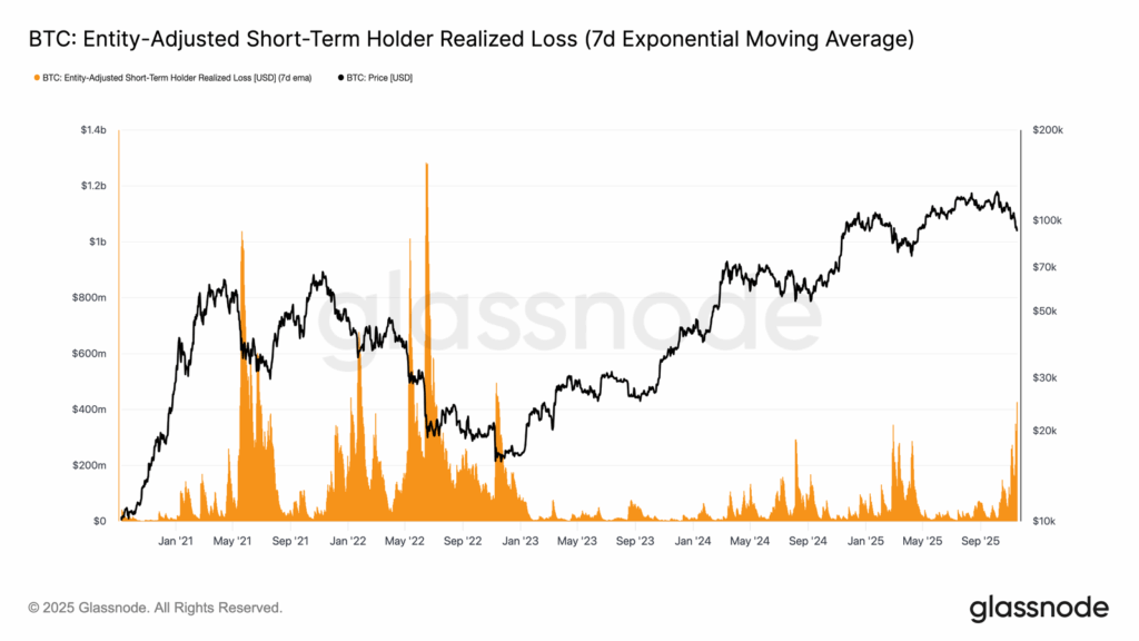 Rata-rata realisasi kerugian STH dalam periode 7 hari EMA melonjak hingga $523 juta per hari, level ini merupakan yang tertinggi sejak momen kejatuhan FTX pada 2022.
