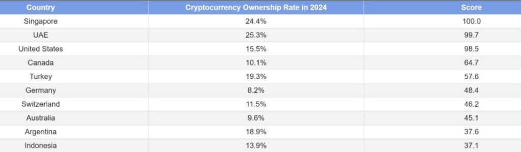 Sementara Indonesia tercatat menempati posisi ke-10 dengan skor 37,1. Menurut ApeX, tingkat kepemilikan kripto di Indonesia mencapai 13,9%, lebih tinggi dari Swiss, Kanada, Australia, dan Jerman, yang juga ada dalam daftar tersebut.