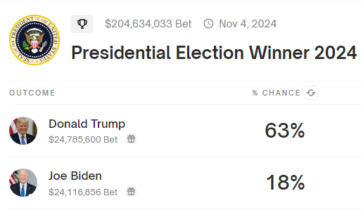 Sebanyak 63% pengguna bertaruh bahwa eks presiden AS Donald Trump akan memenangkan Pemilu AS 2024, dengan jumlah taruhan sebesar $128 juta. Sementara yang bertaruh untuk kemenangan calon presiden petahana AS Joe Biden hanya sebesar 18% dengan jumlah taruhan $36,7 juta.