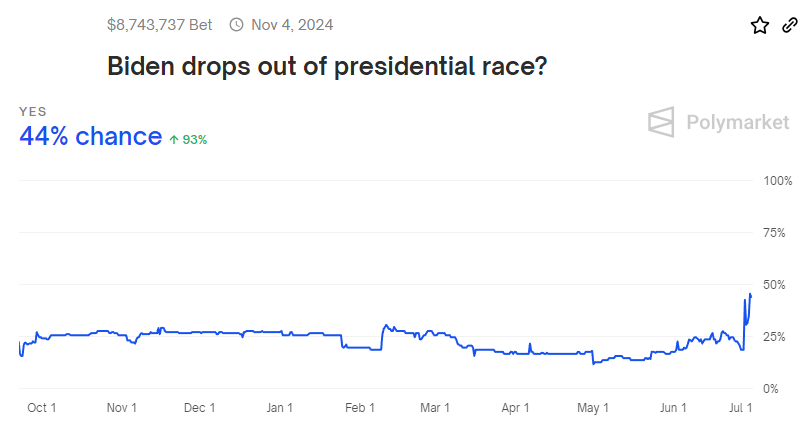 Dari hasil pertaruhan itu terlihat juga ada banyak pengguna yang bertaruh bahwa calon presiden petahana AS Joe Biden akan mundur dari pencalonan sebelum pemungutan suara digelar pada November mendatang.