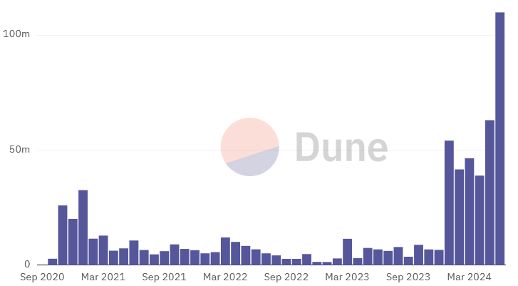 Total volume perdagangan platform yang berjalan di jaringan Polygon ini mencapai total $109,9 juta bulan lalu. Menurut data Dune Analytic, pada Juni ini untuk pertama kalinya Polymarket menembus volume di atas $100 juta.