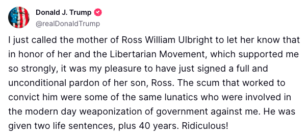 “Saya baru saja menelepon ibu dari Ross William Ulbricht untuk memberitahukan bahwa sebagai penghormatan kepada dirinya dan Gerakan Libertarian yang sangat mendukung saya, adalah kehormatan bagi saya untuk menandatangani pengampunan penuh dan tanpa syarat untuk putranya, Ross,” tulis Trump.