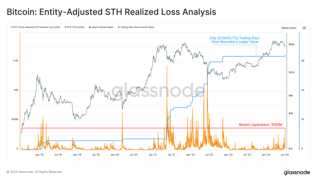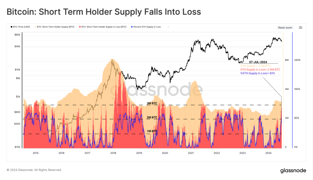 Metrik Glassnode menunjukkan, saat Bitcoin jatuh ke kisaran harga $53k pekan lalu, ada sekitar 2,8 juta BTC milik STH yang masuk dalam unrealized loss. Kondisi serupa sudah terjadi dua kali dalam 12 bulan terakhir.