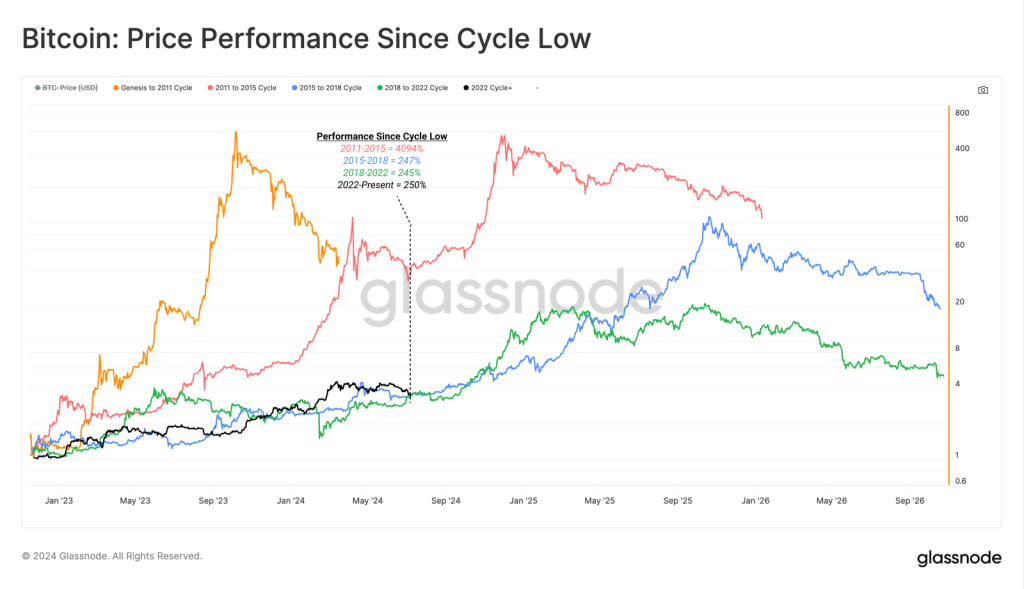 Kinerja harga Bitcoin di siklus 2022-2024 yang mencapai 250% ternyata cukup mirip dengan siklus 2018-2022 yang mencapai 245% dan 2015-2018 yang mencapai 247%.