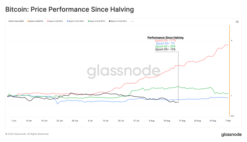 Pada epoch 5 setelah rewards dipangkas menjadi 3,125 BTC di halving keempat, kinerja Bitcoin melorot hingga 13%.