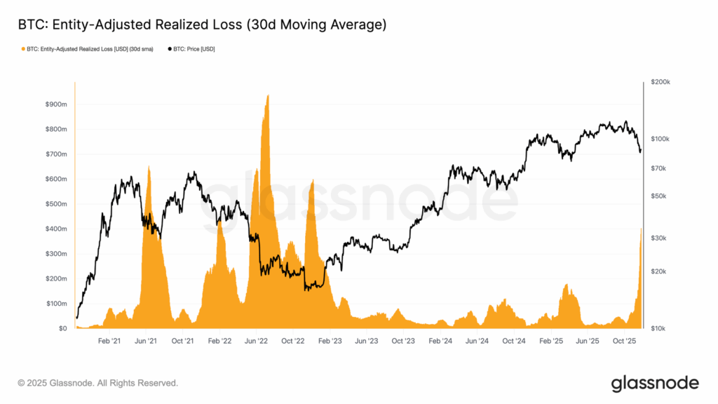 Membandingkan siklus harga saat ini dengan periode kuartal pertama 2022, ada satu indikator yang benar-benar mencolok, yakni Entity-Adjusted Realized Loss (30D-SMA). Angka ini menunjukkan total kerugian yang benar-benar terkunci oleh investor saat mereka menjual koin di bawah harga beli.