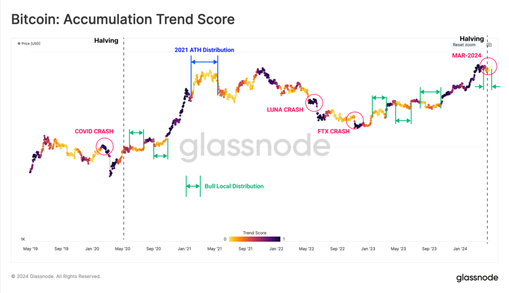 Dalam metrik Accumulation Trend Score, terlihat ada pola sama, yakni ketika Bitcoin mencapai titik tertinggi yang baru, akan terjadi tekanan jual yang cukup tinggi juga, karena investor akan mulai membawa pasokan yang tidak aktif untuk masuk ke pasar guna memenuhi permintaan.