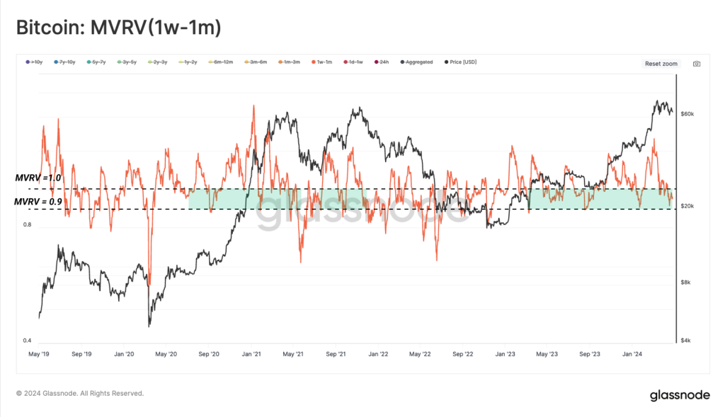 Glassnode menunjukkan, rasio Market Value to Realised Value (MVRV) untuk STH 1w-1m biasanya turun ke kisaran 0,9-1 selama koreksi harga. Dengan demikian, harga pasar bisa turun 0% hingga 10% dari harga beli (cost basis) mereka.