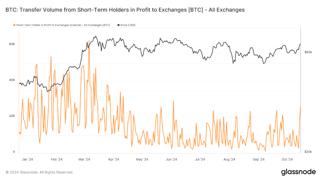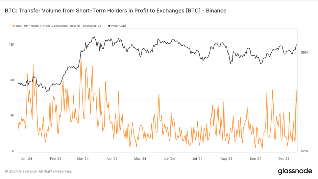 Glassnode menunjukkan, pada 14 Oktober lalu, jumlah BTC yang dikirim oleh wallet STH ke exchange Binance melonjak. Totalnya mencapai 7.127 BTC atau sekitar $480 juta (Rp7,4 triliun).