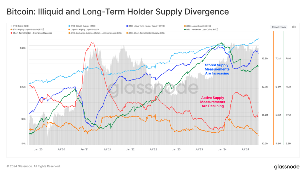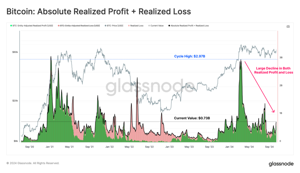 Dalam metrik Liveliness, terlihat ada peningkatan signifikan dalam transaksi BTC pada periode Juli dan Agustus. Momen ini dikaitkan dengan distribusi koin dari exchange Mt Gox yang telah bangkrut kepada krediturnya.