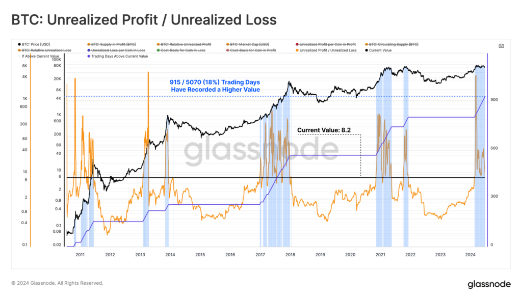 Jika melihat rasio antara keuntungan yang belum terealisasi (unrealized profit) dan kerugian yang belum terealisasi (unrealized loss) per koin, terlihat jumlah koin yang dalam posisi profit berada lebih banyak 8,2 kali lipat dibandingkan dengan koin yang rugi.