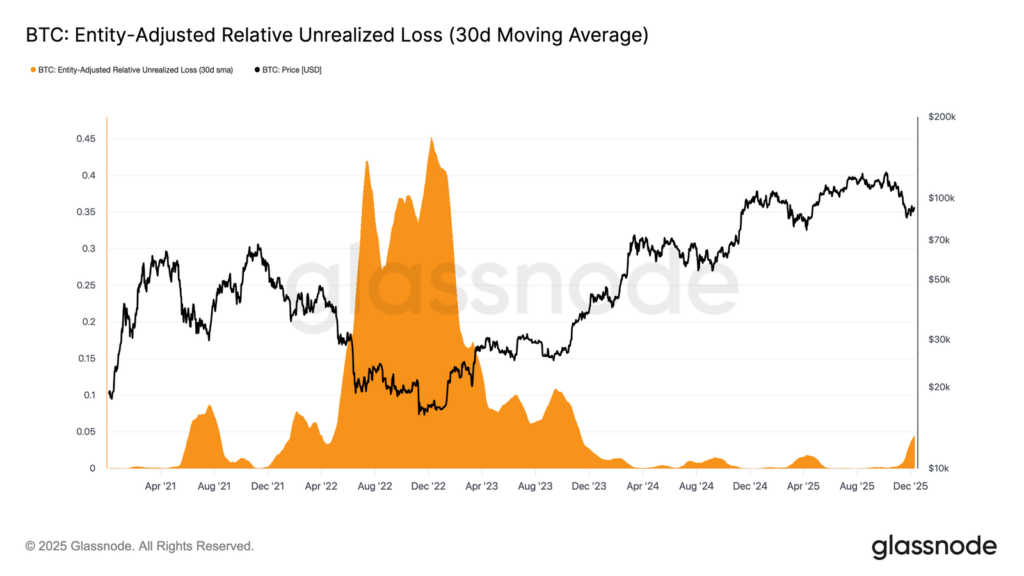 Relative Unrealized Loss (rata-rata per 30 hari/30D-SMA) kini naik ke 4,4% setelah hampir dua tahun berada di bawah 2%. Lonjakan ini menunjukkan perubahan fase dari kondisi euforia ke fase tekanan dan ketidakpastian yang lebih tinggi.