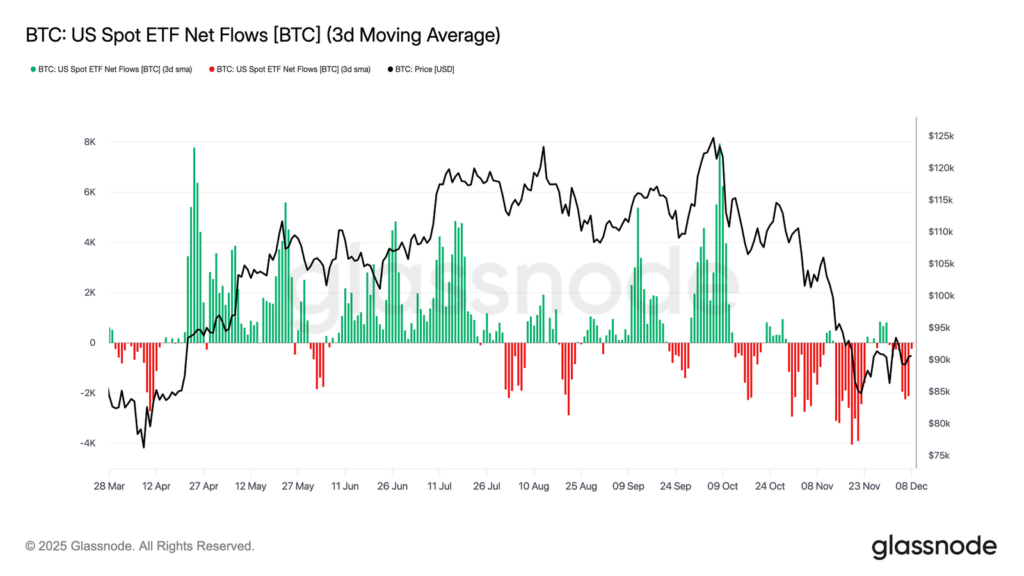 Beralih ke pasar spot, ETF Bitcoin di Amerika Serikat (AS) kembali mengalami pekan yang sepi. Rata-rata arus masuk bersih selama tiga hari tetap berada di bawah nol, yang memperpanjang tren pelemahan yang mulai terlihat sejak akhir November.