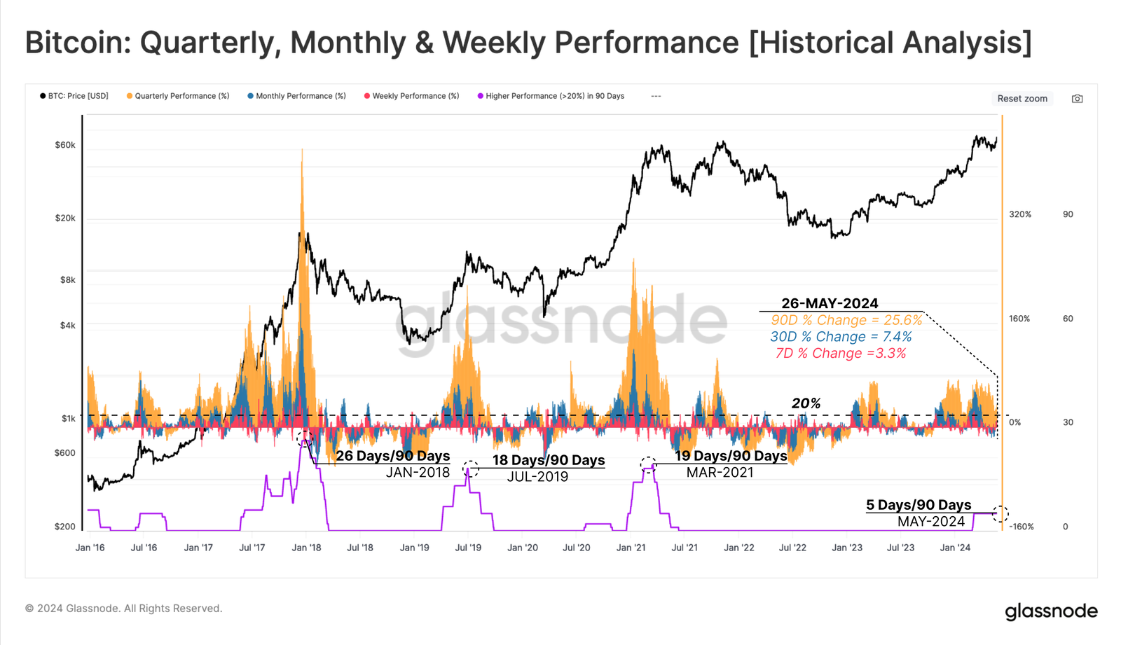 Metrik Glassnode mengungkapkan, Bitcoin juga mencatatkan kinerja cukup kuat dalam waktu mingguan, bulanan, dan triwulanan terakhir, yang masing-masing mengalami kenaikan 3,3%, 7,4% dan 25,6%.
