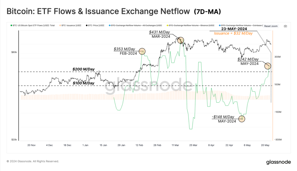 Namun setelah itu, keadaan berbalik. Pekan lalu, arus masuk ETF Bitcoin melonjak hingga $242 juta per hari, yang menunjukkan kembali naiknya tekanan beli. Jumlah ini delapan kali lebih besar dari tekanan jual harian penambang BTC sebesar $32 juta per hari.