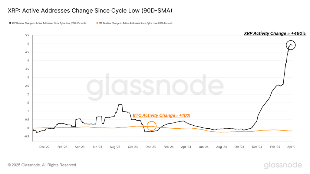 Sejak menyentuh harga terendah pada 2022, jumlah active address harian XRP, berdasarkan rata-rata triwulanan, melonjak sebesar 490%. Angka ini jauh melampaui Bitcoin yang hanya mencatatkan kenaikan sekitar 10% pada periode yang sama.
