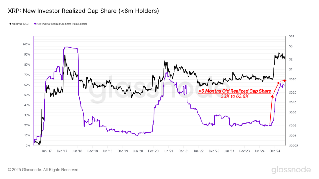 Dalam waktu singkat, Realized Cap XRP hampir naik dua kali lipat, dari $30,1 miliar menjadi $64,2 miliar. Yang menarik, hampir $30 miliar dari pertumbuhan tersebut berasal dari investor yang baru masuk dalam enam bulan terakhir.
