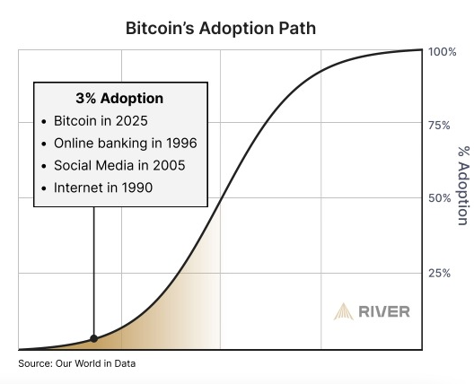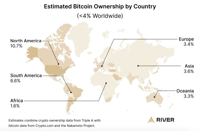 River juga mempertimbangkan faktor alokasi institusional yang masih rendah serta tingkat kepemilikan individu untuk memperkirakan tingkat adopsi Bitcoin saat ini.