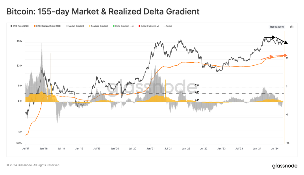 Periode konsolidasi yang telah berlangsung sejak halving keempat Bitcoin pada April 2024 ini menyebabkan market gradient pemegang Bitcoin jangka pendek atau short-term holder (STH) berubah menjadi negatif. Sementara realized price gradient tetap positif, meski trennya lebih rendah.