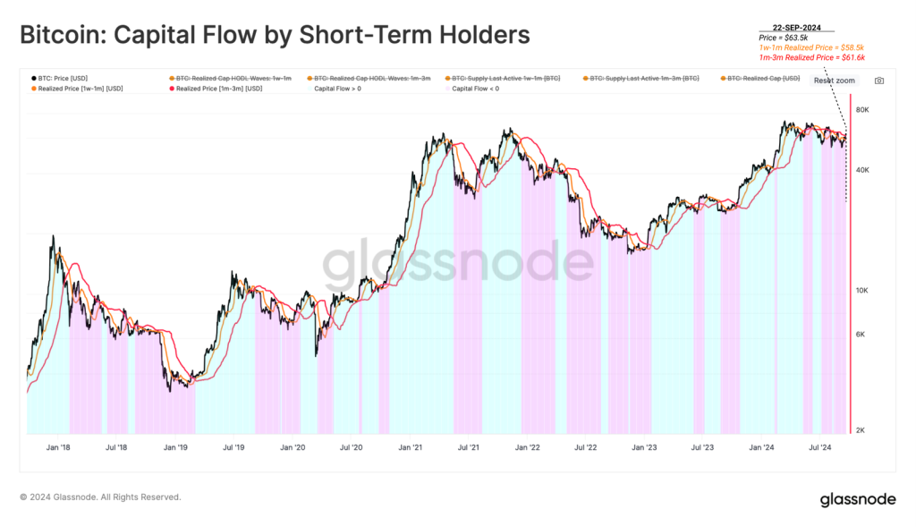 Analisis terkait stagnasi harga Bitcoin ini mengungkapkan bahwa STH, khususnya mereka yang telah memegang Bitcoin selama satu minggu (1w) hingga tiga bulan (3m), memainkan peran yang signifikan.
