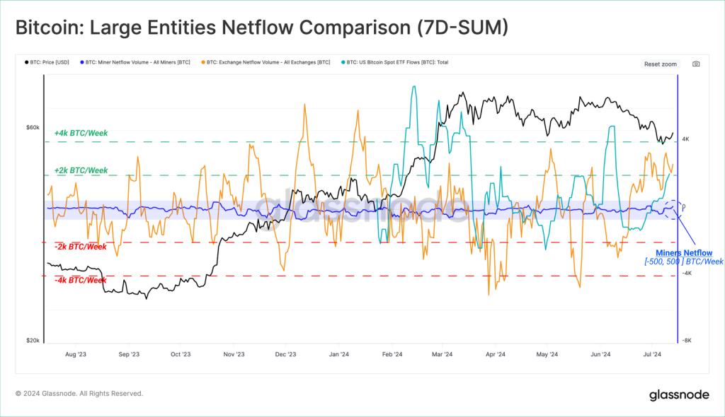Dua entitas itu mengalami perubahan netflow hingga lebih dari 4.000 BTC per minggu. Sementara penambang hanya di kisaran 500 BTC per minggu, dan dianggap lebih stabil.