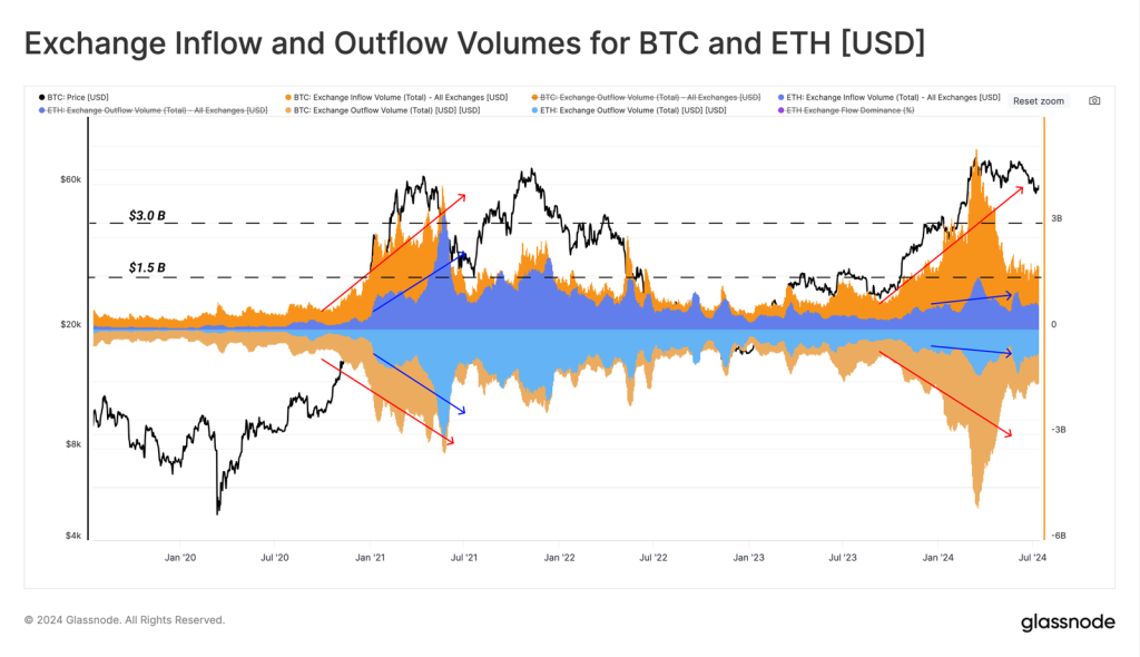 Jumlah Bitcoin yang disimpan dan ditarik dari exchange cenderung menjadi katalis bagi investor dan likuiditas pasar. Setelah Bitcoin menyentuh all-time high (ATH) pada Maret lalu, terjadi penurunan tajam dalam netflow exchange. Sejak itu, volume BTC stabil di kisaran $1,5 miliar per hari.