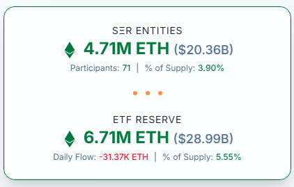 ETH treasuries juga terus bertambah. Menurut StrategicEtherReserve, lebih dari 71 entitas telah membeli sekitar 4,71 juta ETH, atau hampir 4% dari total suplai, senilai sekitar $20,36 miliar.