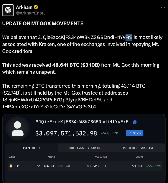 Di saat yang sama, platform data on-chain Arkham Intelligence mengungkapkan adanya aktivitas transfer dari wallet pengelola dana trust atau Trustee Mt. Gox, pada 16 Juli. Ada 48.641 BTC senilai $3,1 miliar yang diyakini ditransfer ke wallet Kraken.