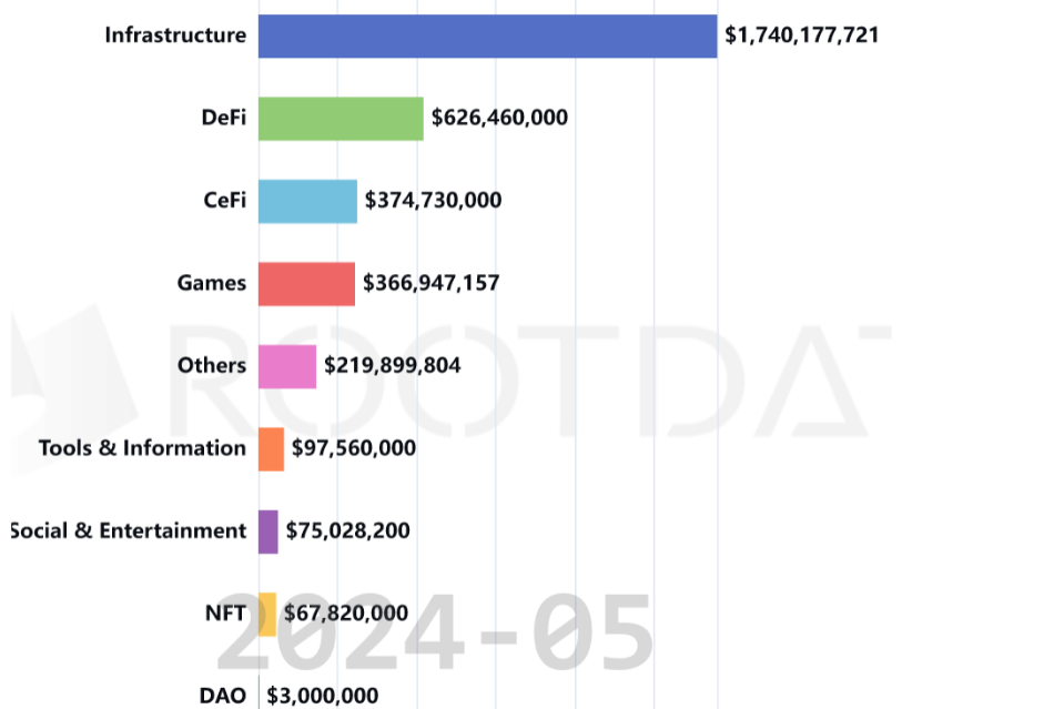 Menurut situs penyedia data proyek kripto RootData, mayoritas dana yang masuk digunakan untuk pengembangan infrastruktur industri kripto. Untuk sektor ini, dana yang digelontorkan mencapai lebih dari $1,7 miliar.