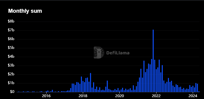 Menurut DeFiLlama, dana yang masuk ke industri kripto sejak Juni 2014 sudah mencapai $100 miliar. Tercatat ada 5.195 putaran pendanaan yang sudah dibuka selama sekitar 10 tahun lalu ini.