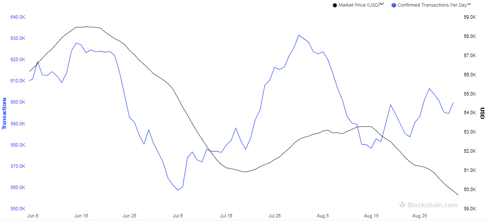 Jumlah rata-rata transaksi harian di jaringan Bitcoin sempat mencapai puncaknya pada 31 Juli sebanyak 631.648 transaksi. Namun menurut Blockchain.com, pada 31 Agustus lalu, jumlahnya menyusut menjadi 594.871.