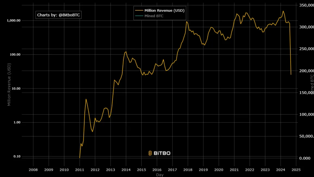 Menurut data Bitbo, sepanjang Agustus, pendapatan penambang mencapai $827,56 juta atau turun lebih dari 10,5% dari $927,35 juta pada Juli. Angka tersebut bahkan anjlok hingga 57% dari Maret 2024, saat harga BTC mencapai titik tertinggi sepanjang masa, dengan pendapatan penambang mencapai $1,93 miliar.