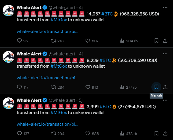 Exchange kripto yang telah bangkrut pada 2014 ini melakukan transaksi melalui beberapa transfer ke alamat wallet tidak dikenal. Transaksi dilakukan pada Selasa, 28 Mei 2024, sekitar pukul 10.00 WIB.