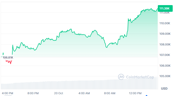 Data CoinMarketCap per 20 Oktober 2025 menunjukkan, Bitcoin mengalami sedikit penguatan di kisaran harga $111.000 dengan kenaikan 5%.