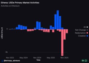 Sepanjang Oktober, investor melikuidasi USDe senilai $5,7 miliar. Tren tersebut tidak berhenti setelahnya. Dalam dua bulan berikutnya, total penarikan mencapai sekitar $8 miliar. Arus keluar ini menjadikan USDe sebagai salah satu stablecoin yang paling terdampak pasca-crash.