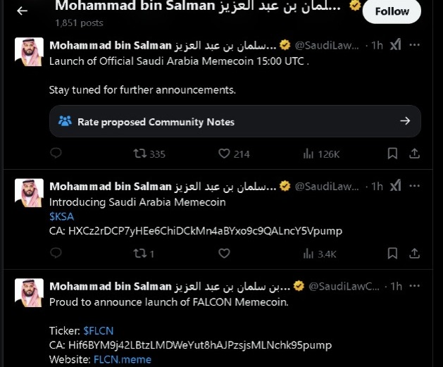 Koin meme Kingdom of Saudi Arabia (KSA) ini diluncurkan pada 17 Februari, lewat pengumuman sebuah akun X bernama “SaudiLawConf,” yang ternyata merupakan akun palsu yang mengatasnamakan Pangeran Mohammed bin Salman.