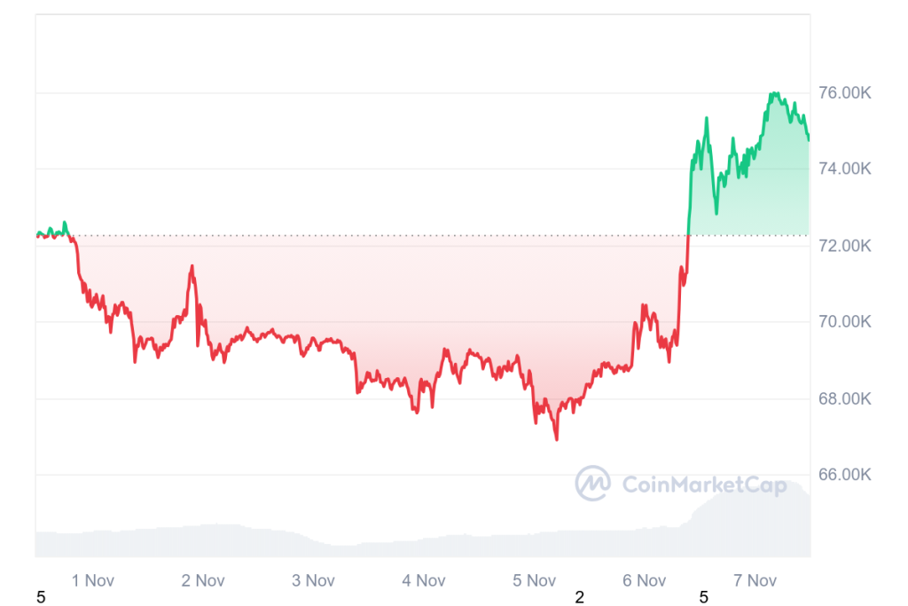 Kemenangan kandidat pro-kripto ini membuat sektor kripto bereuforia, yang ditandai dengan melesatnya harga Bitcoin terus ke ATH baru. CoinMarketCap menunjukkan, pada 7 November 2024, pukul 03.55 WIB BTC melesat ke ATH di $76.203.