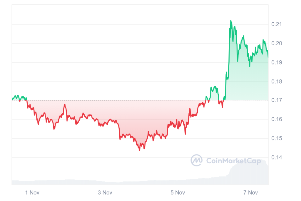 Dogecoin (DOGE) ikut melonjak hingga $0,21 pada 5 November, atau ke tertingginya dalam tujuh bulan terakhir. Saat ini DOGE masih diperdagangkan di kisaran $0,19.
