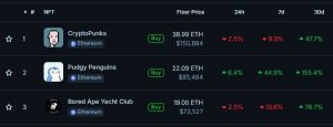 Dari segi item, koleksi NFT Pudgy Penguins menjadi yang terlaris. Penjualan koleksi Pudgy tercatat naik 644% dalam 30 hari terakhir dengan volume $40 juta. Floor price Pudgy juga naik menjadi 22 Ether (ETH) atau $85.000 berdasarkan harga terkini.