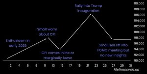FOMC sendiri secara historis punya kuat untuk mempengaruhi pergerakan harga pasar. Teranyar, harga BTC sempat anjlok 5% setelah The Fed mengumumkan kebijakan suku bunga Desember 2024 lalu yang tidak sesuai ekspekstasi pasar. Setelah pertemuan FOMC Desember dan libur akhir tahun, harga Bitcoin terus bergerak dalam kisaran konsolidasi di atas $90.000 dan di bawah $100.000.