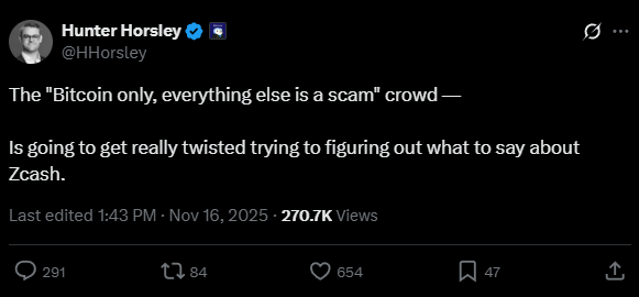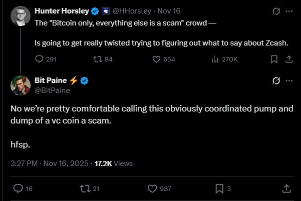 Ketegangan ini bermula dari unggahan CEO Bitwise Hunter Horsley, di platform X. Horsley mengatakan, kelompok pendukung Bitcoin yang kerap beranggapan bahwa koin selain Bitcoin adalah penipuan, akan sulit mencari alasan untuk meremehkan Zcash setelah ZEC mengalami kenaikan harga yang fantastis.